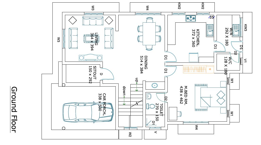 Ground floor - one bedroom with attached bathroom, living/dining hall, kitchen, store room, work area, common toilet, foyer, sit-out and car porch and provision for pooja room.